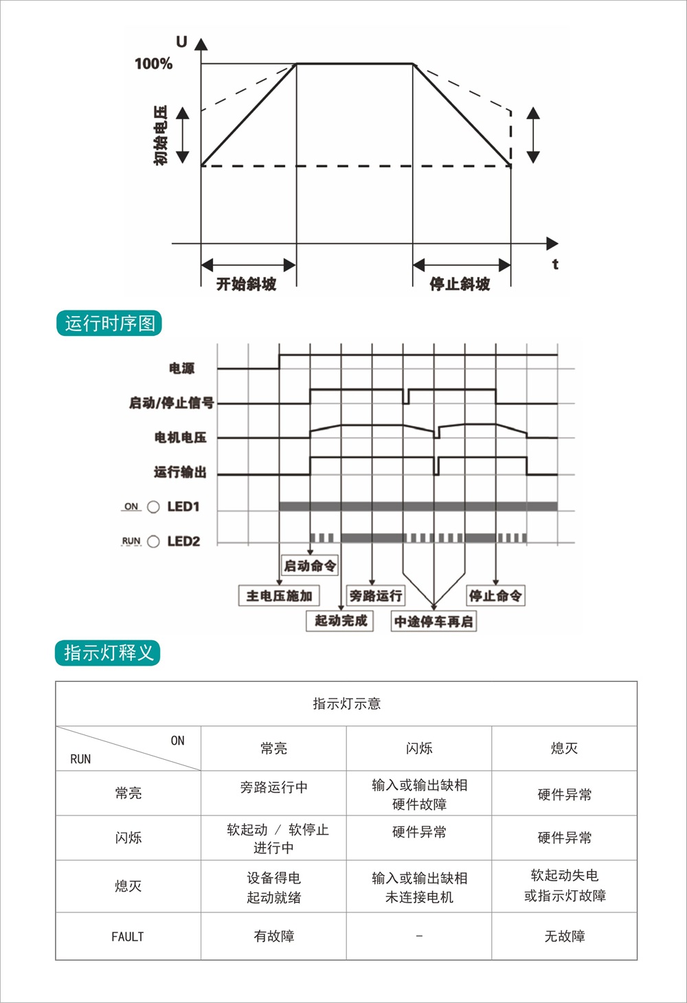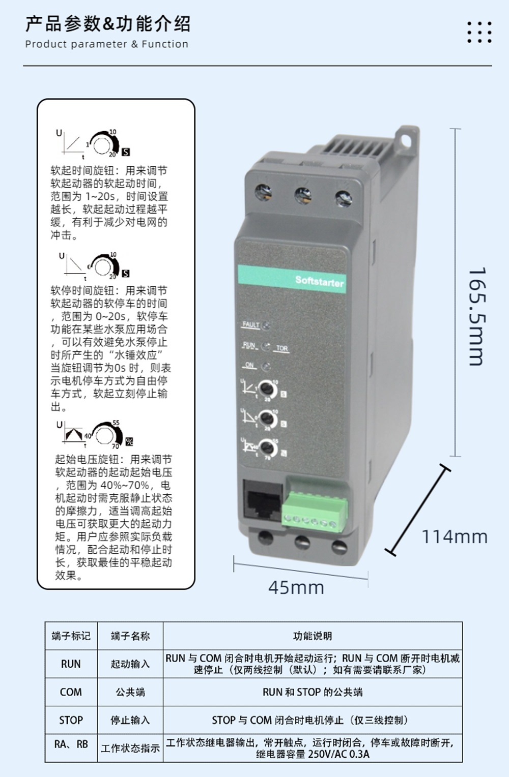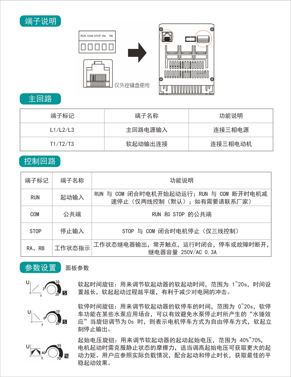 ⾯板上具备可整定的调节旋钮,基于电压斜坡启动模式,直 观的设定电压斜坡的软启动时间,启始电压与软停⽌时间,简单 易⽤。