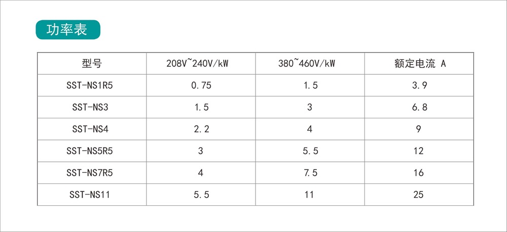 SST-NS系列软启动器是来⾃于SST产品线中,针对⼩功率规格范围开发的⼀款紧凑型内置旁路式软启动器。该系列覆盖功率范围从1.5kW到11kW,兼容电压范围从208V~460V。本系列继承了SST-NX系列的⼤部分优势特性,使⽤简单,内置开关电源,内置运⾏旁路,可选配外接控制键盘。可选配外接面板。内置控制电源,使用简单,操作方便。可适配小功率设备配套