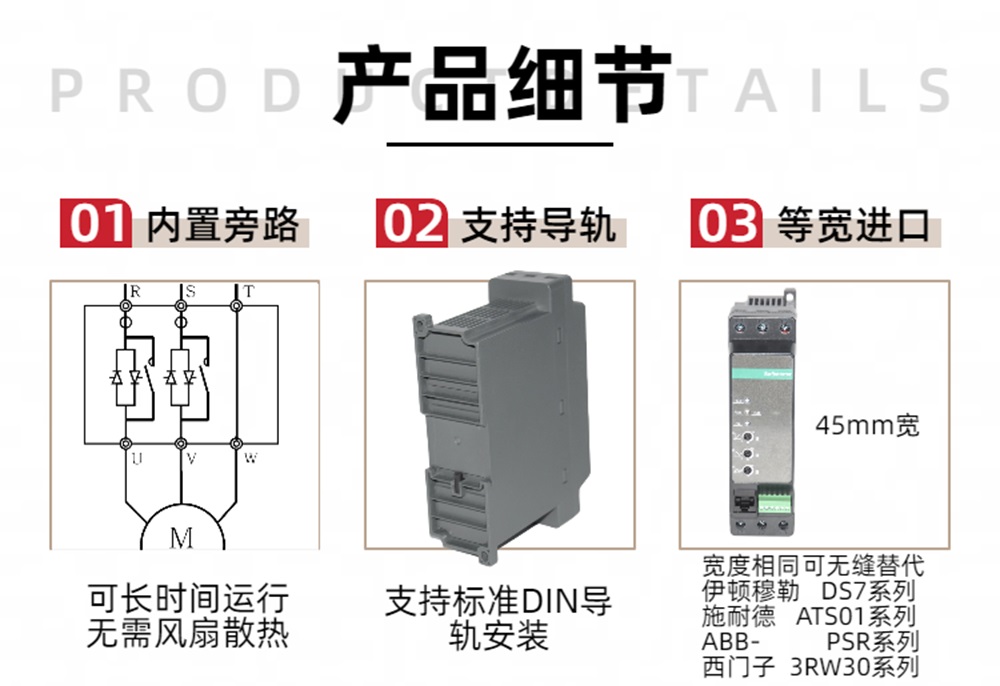 产品内置有基本的电机保护功能,如缺相,过载等。也可设 置为保护全局禁⽤的应急模式,过载范围与过载延时时间可调。产品结构紧凑,与绝⼤多数国际知名品牌尺⼨相仿(尤其宽 度均为45mm),可替代安装。
