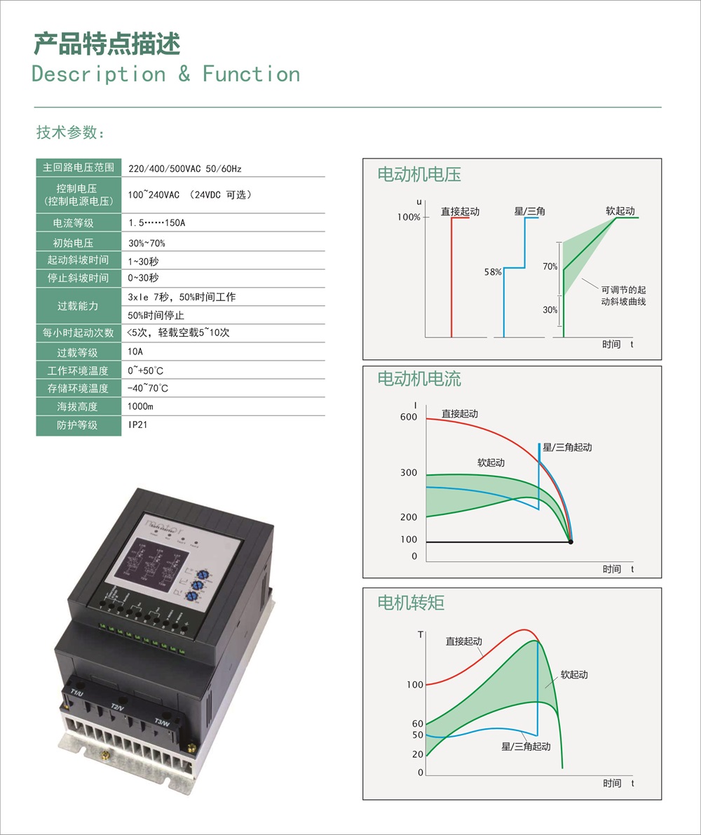 自主研发全新型数字式电机软起动产品 , 完美控制电机在起动过程中平滑加速、停止过程中平滑减速,并停供针对电动机及产品自身的保护功能。功率范围为0.75-75KW,支持单相电机规格,集成内置旁路和可扩展的紧凑型中小功率软启动器。广泛应用于机械设备配套。体积小适应性强。