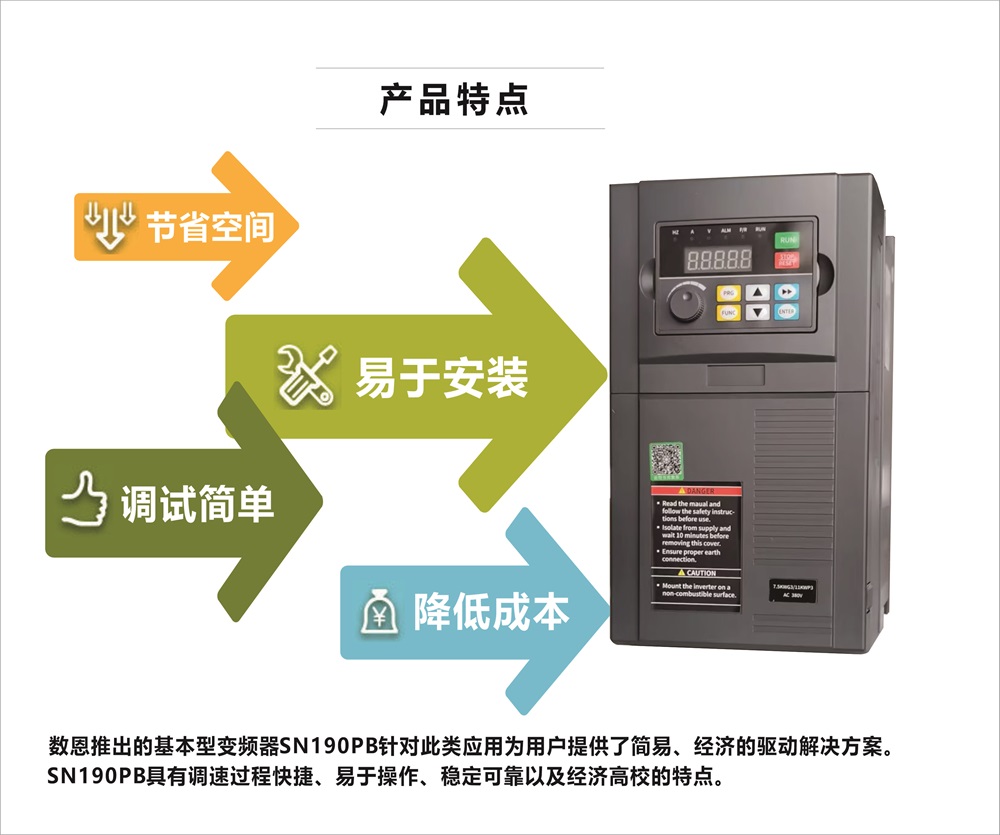 SN190PB系列变频器, 是针对传统农业、 工业及制造业等领域所研制的通用型变频器,广泛适用于风机水泵、 印刷包装、 电力建材、 冶金化工、 市政消防等行业。 该系列变频器具有性能卓越、 功能丰富、 结构精巧、 操作简单、 安全可靠、 环境适应性好等特点。