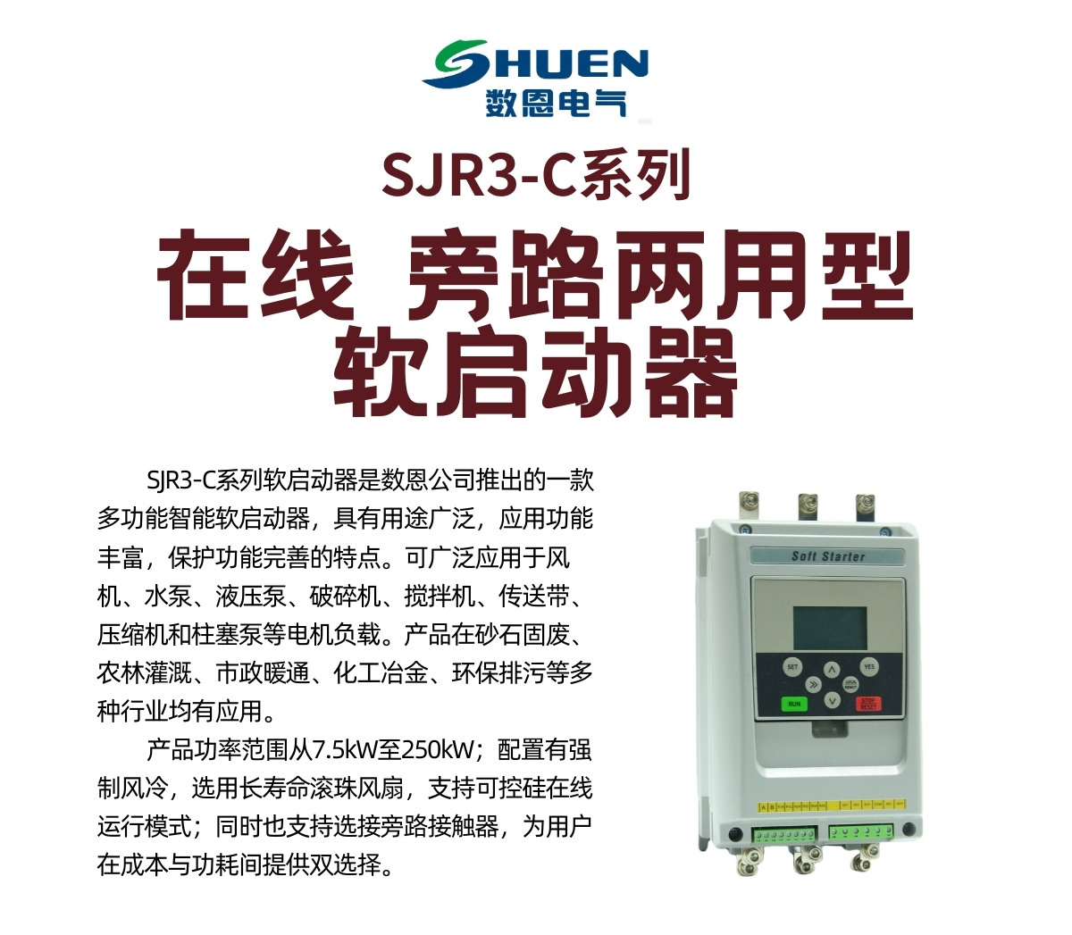 SJR3-C系列是一款多功能智能软启动器。支持在线式运行(不连接旁路接触器),也可以选配连接旁路接触器。具有用途广泛,功能丰富,保护功能完善的特点。